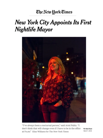 After years of service on her local community board and as a founding member of the New York City Hospitality Alliance, Ariel was appointed by Mayor Bill de Blasio to establish and lead New York City’s first Mayor's Office of Nightlife. In connection with this appointment, she became publicly known by the designations NIGHT MAYOR and NIGHTLIFE MAYOR, which identified her leadership of the City’s dedicated mayoral initiative focused on the nighttime economy. Serving across two administrations, she led efforts to improve coordination between the City, the hospitality industry, and local communities by addressing systemic challenges and advancing proactive, non-punitive strategies that support business vitality, safety, quality of life, equity, and harm reduction.